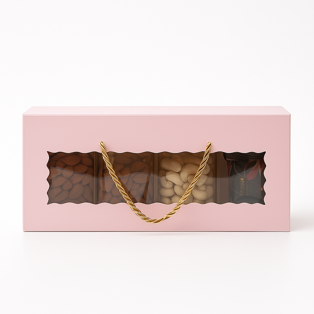 Make festive gifting effortless and elegant with Mudrit Hamper Gift Boxes. Designed for celebrations big and small, these premium boxes feature a sturdy build, stylish twine handle, and a clear window to beautifully showcase your gifts—perfect for Diwali, weddings, birthdays, and party favors.