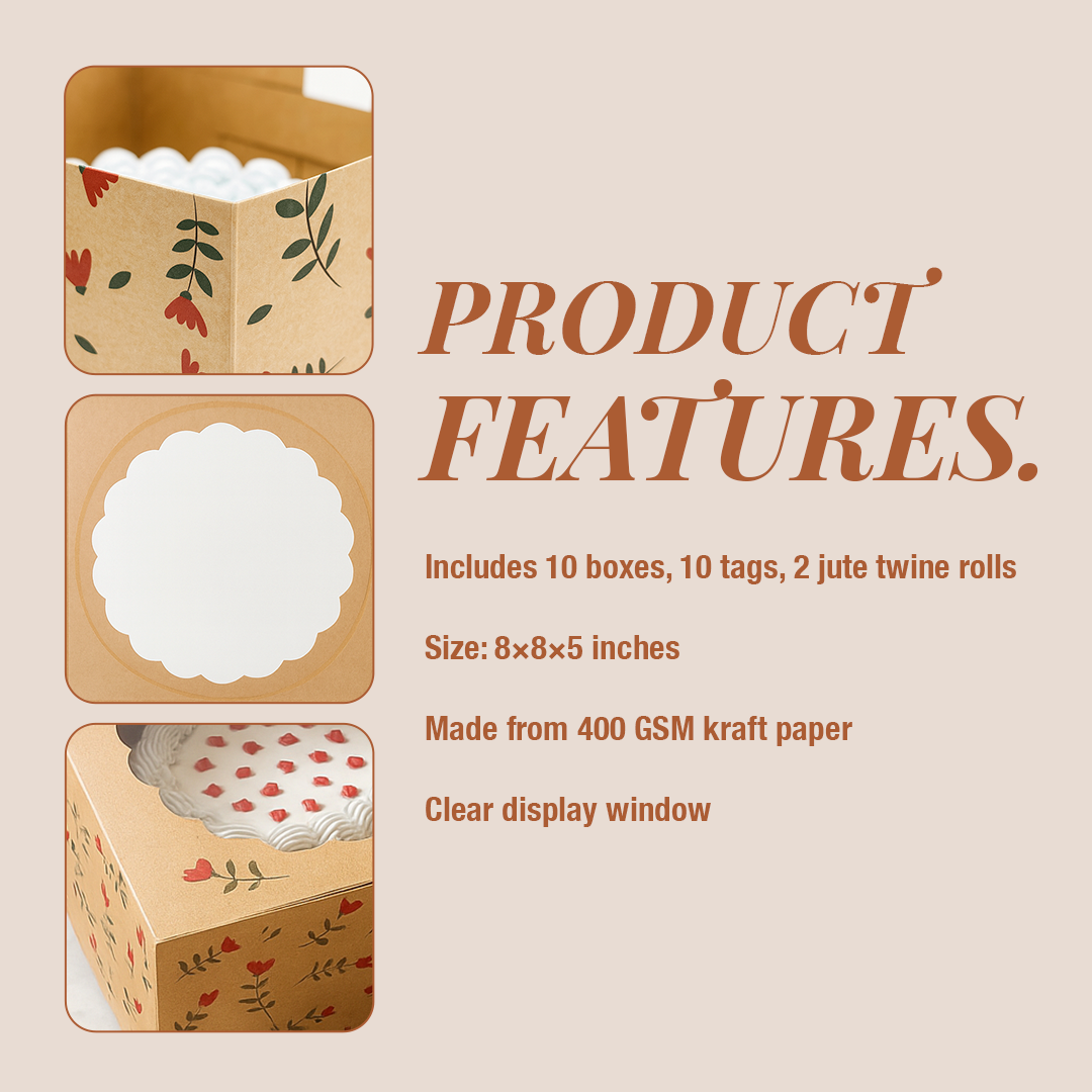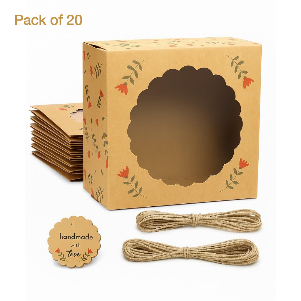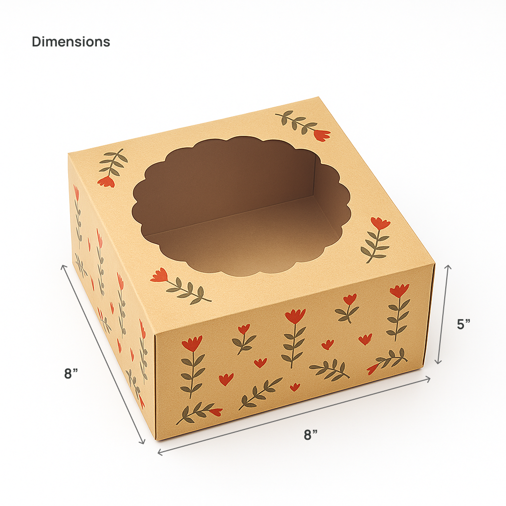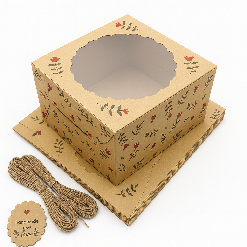 Present your baked creations beautifully with Mudrit’s Cake Box with Window. Designed to hold half kg and 1 kg cakes, this sturdy kraft box features a clear window to showcase your treats while keeping them fresh and protected. Complete with gift tags and jute twine, it’s perfect for bakeries, celebrations, and thoughtful gifting.