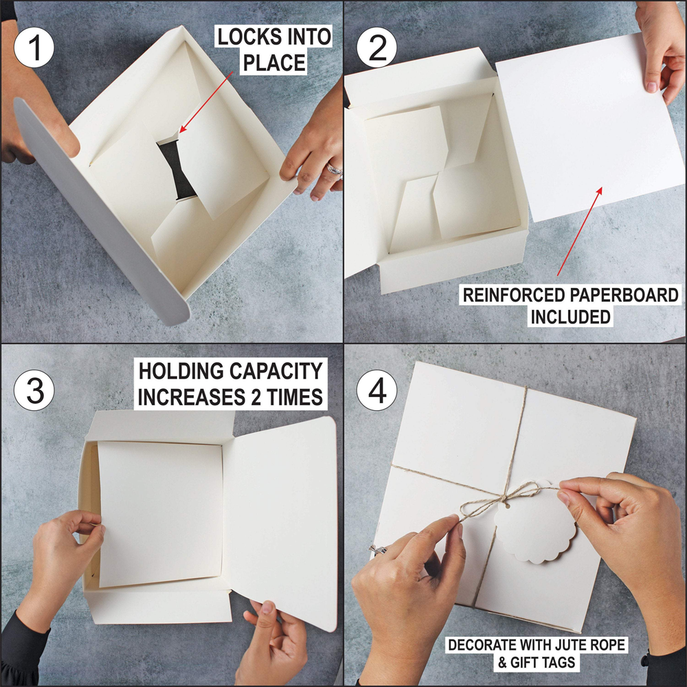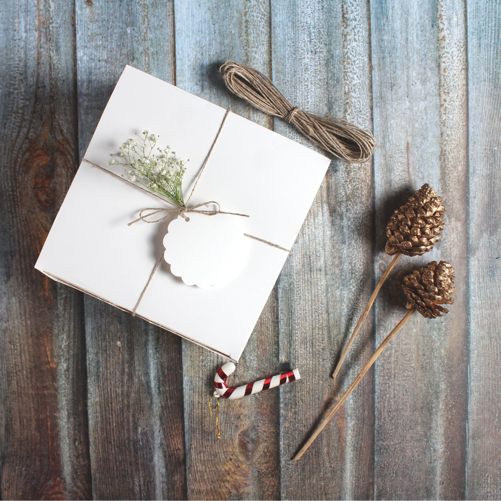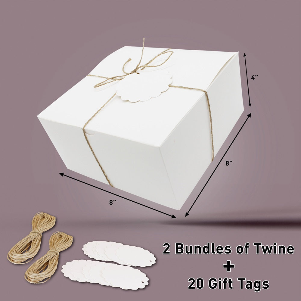 Stylish and eco-friendly, our White Gift Boxes are perfect for all occasions. These durable 8"x 8"x 4" boxes can hold small glass jars, homemade baked goods, soaps, or ornaments. Featuring a charming rustic look with bonus tags and jute twine, they’re ideal for gifting, storing, or wedding favors.
